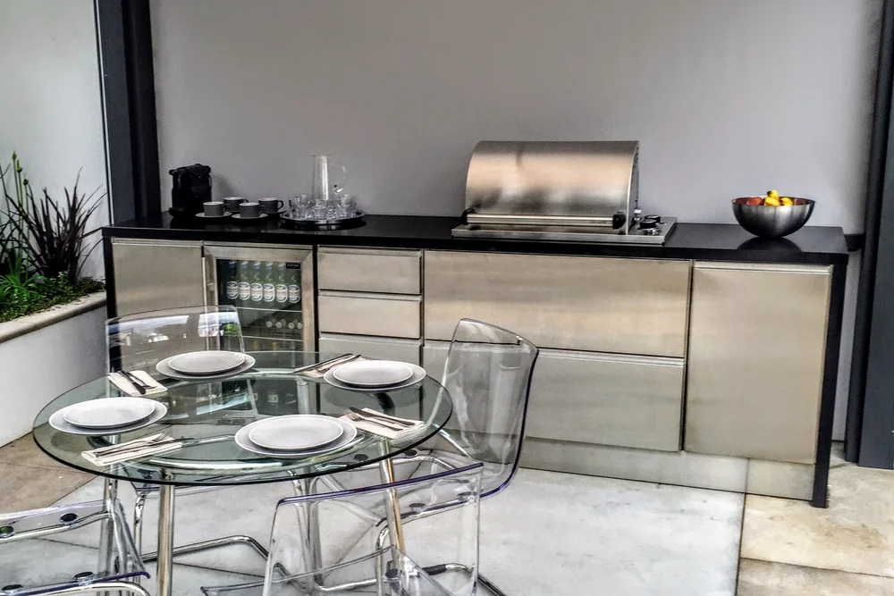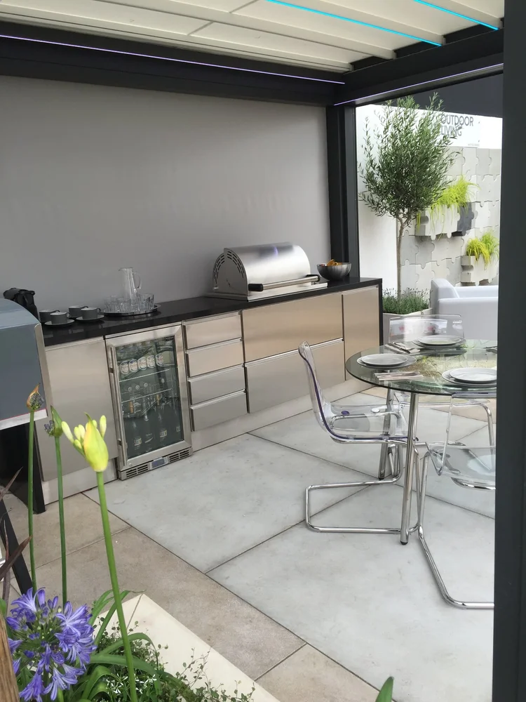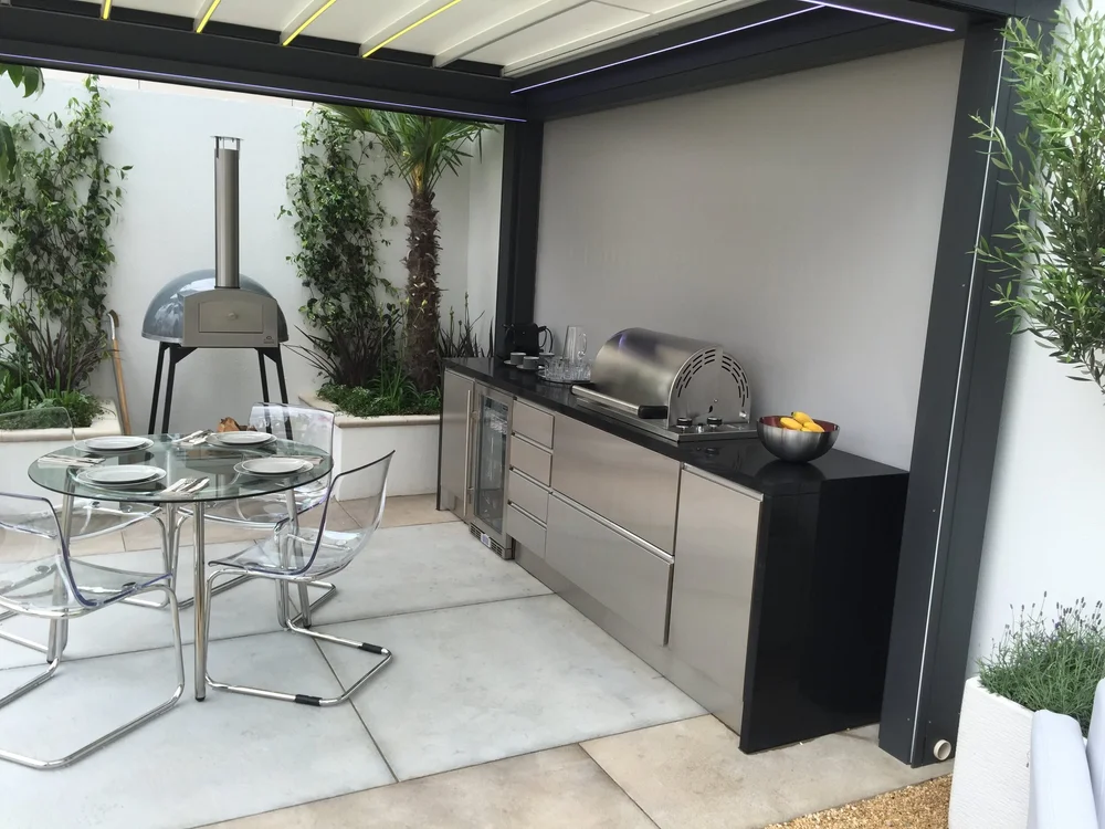 For this fully bespoke outdoor kitchen we commissioned the fabrication of the cabinets using 316 marine grade stainless steel to house the Firemagic Regal grill. The fully retractable pergola canopy provides shade and rain cover yet can be opened up to enjoy blue skies at the touch of a button.