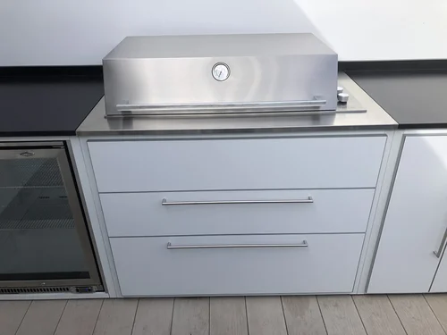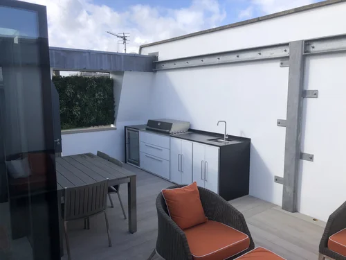 This Notting Hill rooftop setting created the perfect urban oasis for cooking outdoors. Our Fresco Frames system provides full soft close cabinetry with a worktop from Lapitec made sintered stone in a smooth satin finish. The Beefeater Proline grill has been converted to run on the mains natural gas supply so no heavy propane gas cylinders need to be carried upstairs.