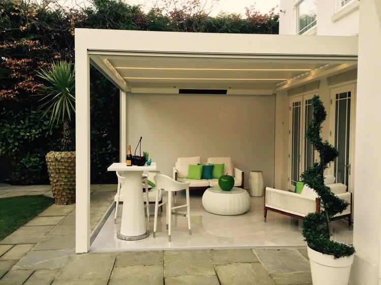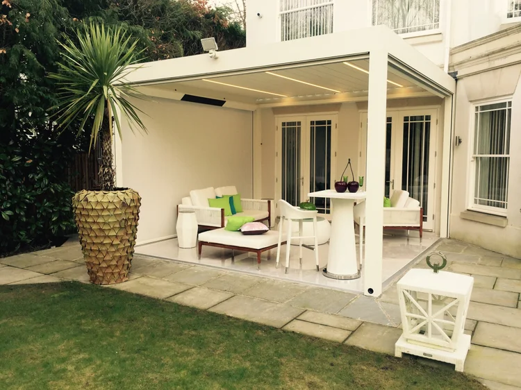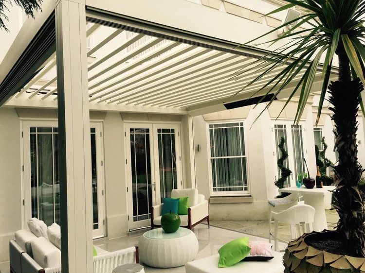 Using the Renson Camargue pergola system a covered seating area was created to provide a sheltered seating area to enjoy a morning coffee or evening aperitif whatever the weather.