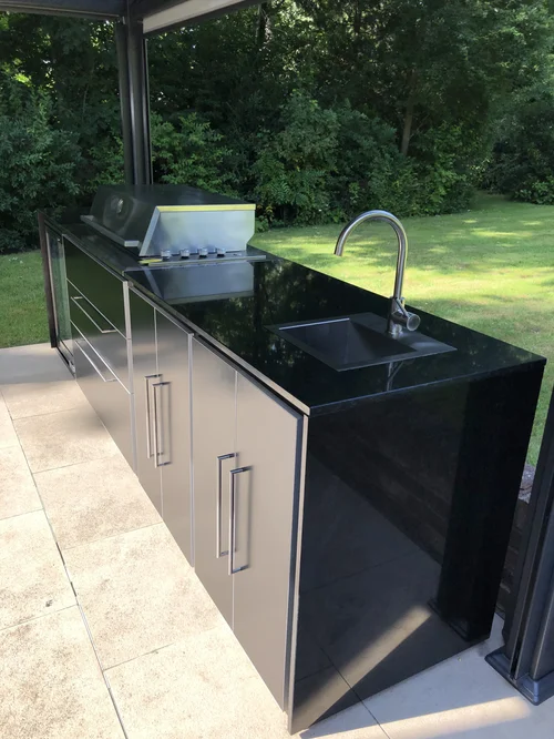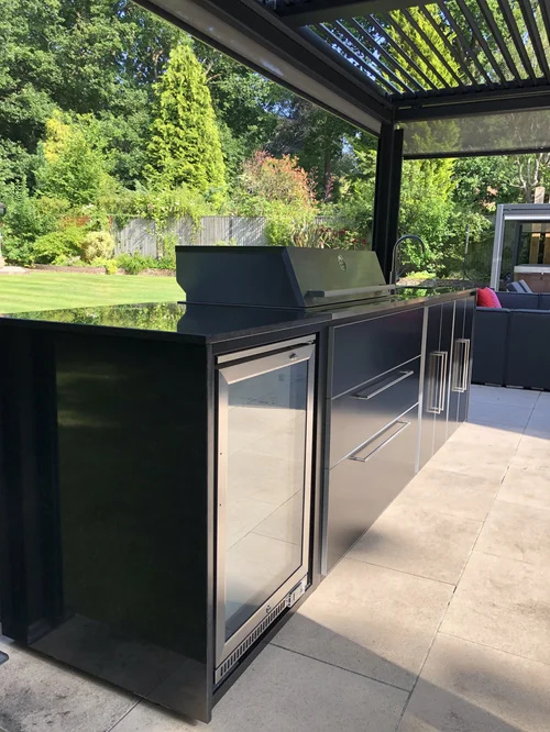 This sleek and stylish outdoor kitchen was created using our Fresco Frames system incorporating a Beefeater Proline grill, beverage fridge and sink